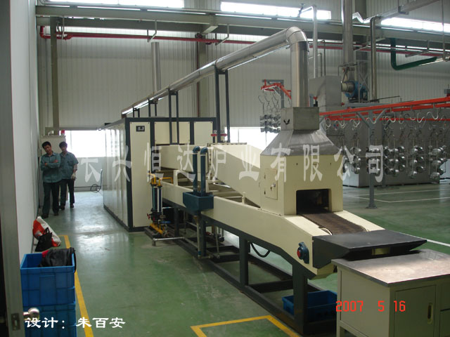 該設(shè)備由傳動(dòng)機(jī)構(gòu)(進(jìn)料段)、預(yù)熱段、加熱爐體、冷卻段、從動(dòng)機(jī)構(gòu)(出料段)、水路氣路控制系統(tǒng)、電氣控制系統(tǒng)及液氨分解爐等組成。
